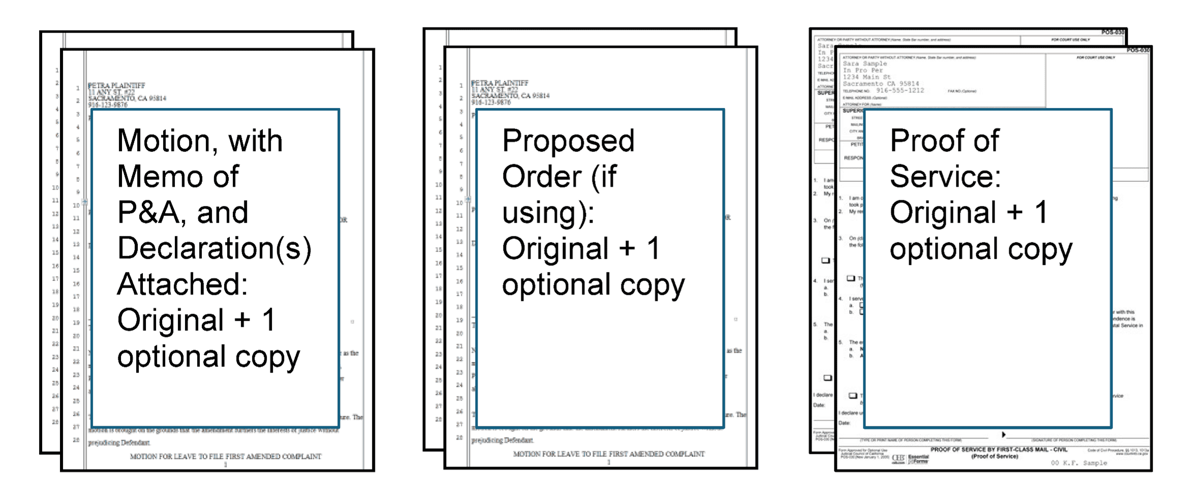 The Notice of Motion and Motion, Memorandum of Points and Authorities, and Declaration(s) may be filed as separate documents or combined together into the same document. The template and samples in this Guide combine them into one. The Proposed Order (if included) is always filed as a separate document. California Rule of Court (CRC) 3.1112.