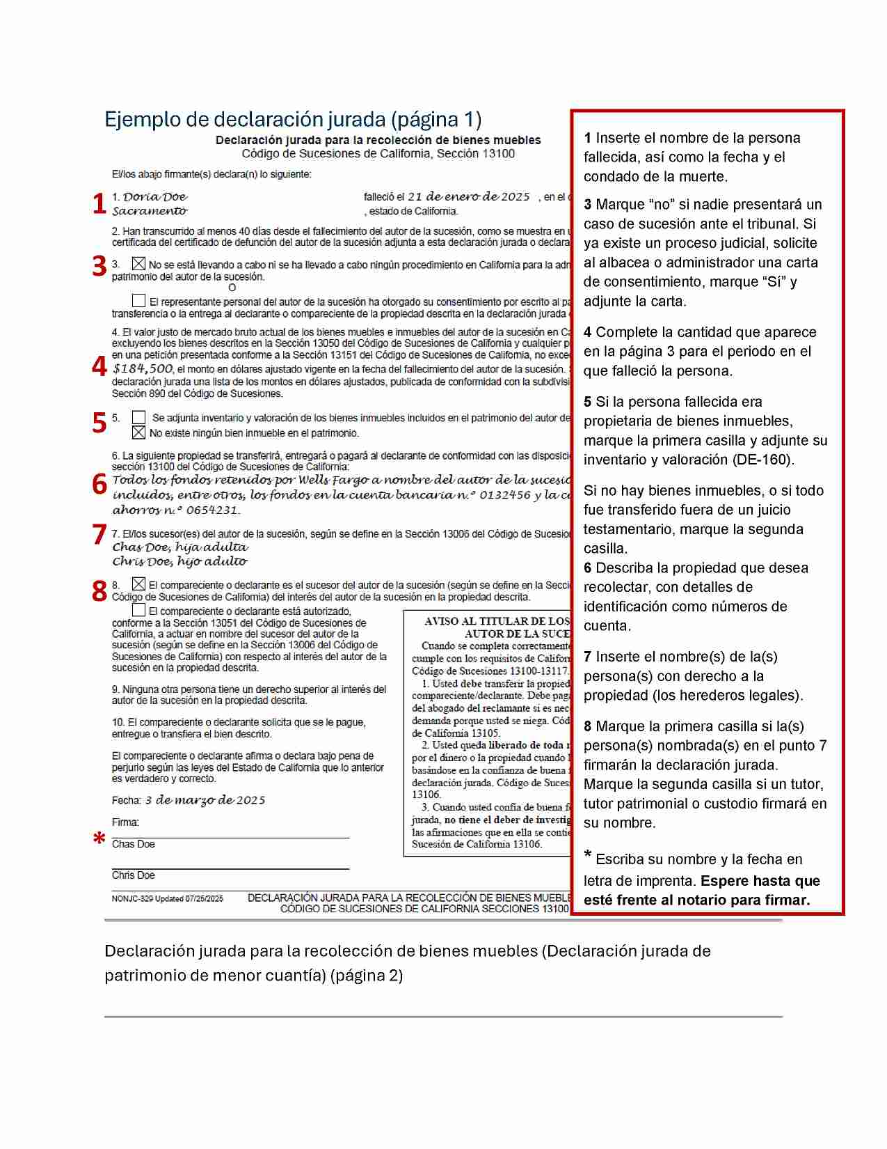 - Declaración jurada de patrimonio de menor cuantía (Declaración jurada para la recolección de bienes muebles) – PDF (Small Estate Affidavit (Affidavit for Collection of Personal Property))