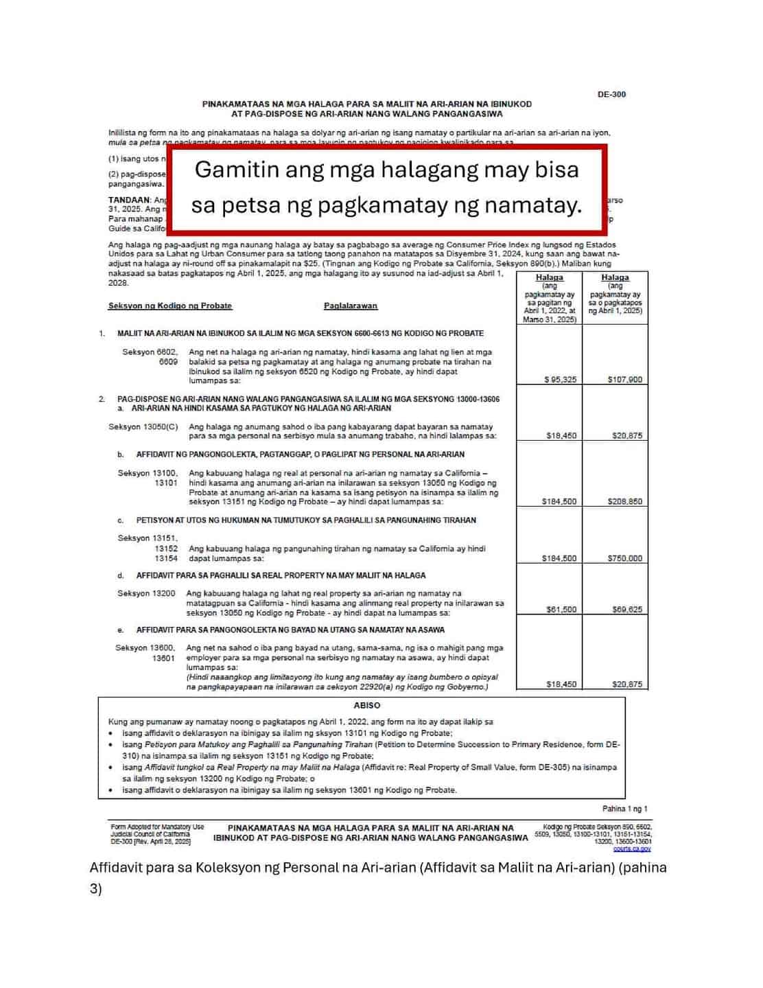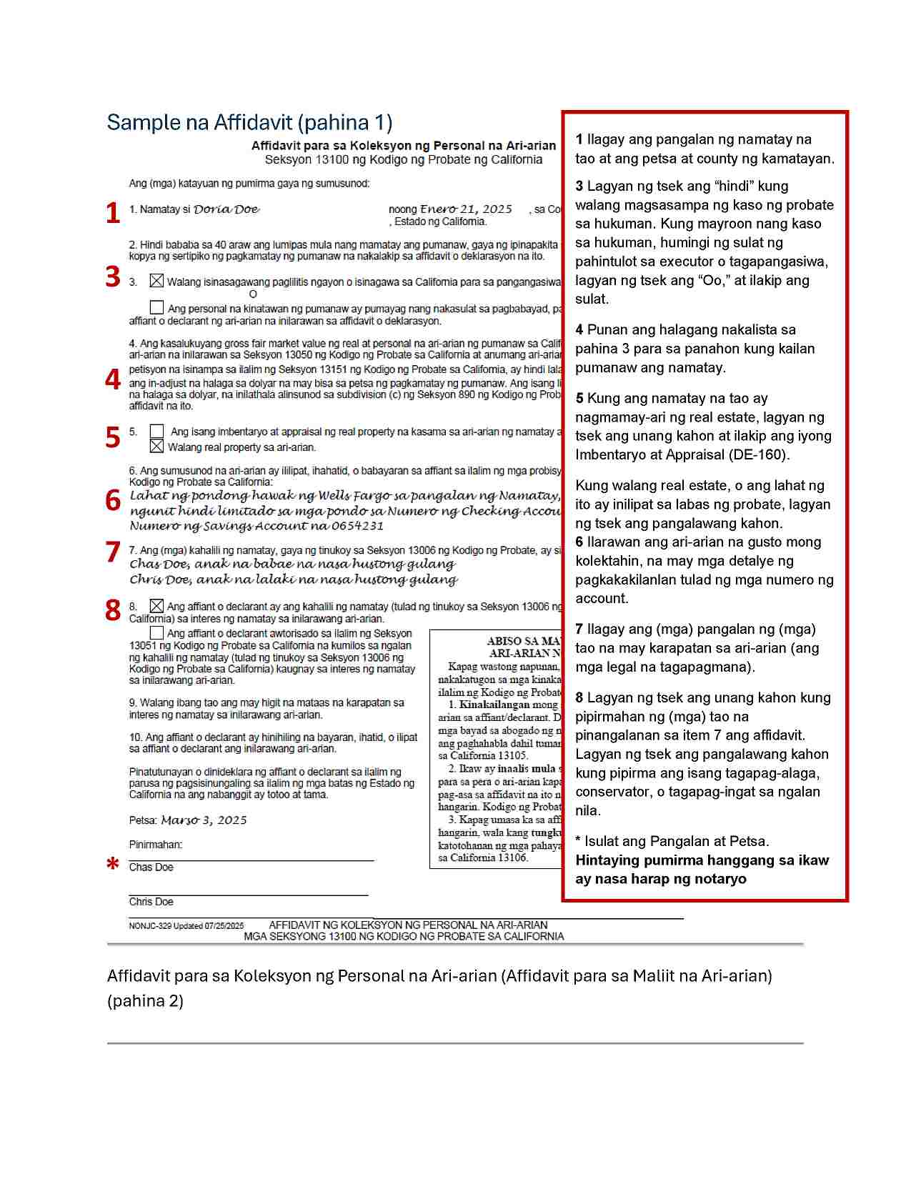 Ang mga instruksyon para sa pagkumpleto ng Affidavit para sa Koleksyon ng Personal na Ari-arian ay kasama sa dulo ng gabay na ito.